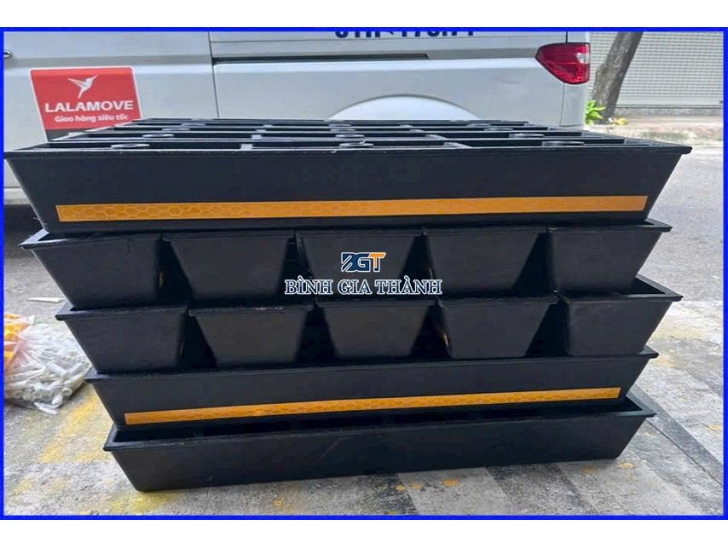 Vật liệu Chính: Hầu hết các cục chặn lùi xe hiện đại có phản quang đều được sản xuất từ Cao su Tái chế Chịu lực (Recycled Heavy-duty Rubber) hoặc Polyethylene/Polyurethane (PU). Cao su là vật liệu phổ biến nhất vì nó có độ đàn hồi cao, khả năng hấp thụ sốc tốt, chống nứt vỡ dưới sự thay đổi nhiệt độ (khác với bê tông) và chịu được mài mòn liên tục.