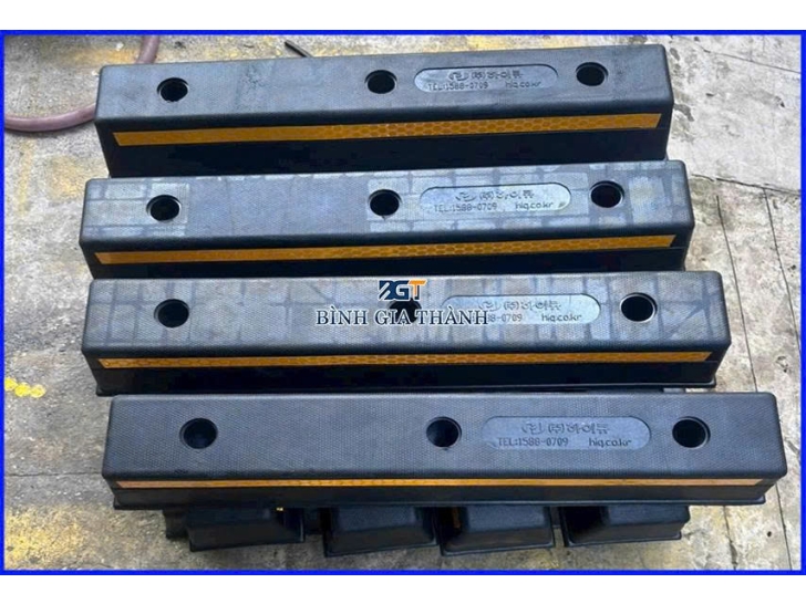 Dải Phản Quang: Đây là tính năng khác biệt cốt lõi. Cục chặn được tích hợp các dải vật liệu phản quang (reflective strips) chất lượng cao, thường có màu vàng, trắng hoặc xanh nổi bật, được đúc hoặc dán chắc chắn vào thân cục chặn màu đen hoặc xám.