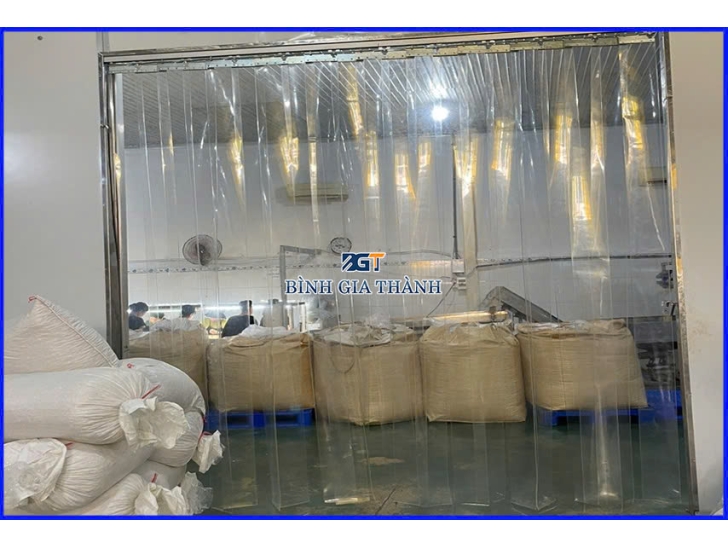 Màn nhựa PVC được lắp tại các cửa chính nơi xe nâng và công nhân ra vào thường xuyên. Nó giúp ngăn bụi đường, lá cây và côn trùng xâm nhập vào khu vực sản xuất, đảm bảo tiêu chuẩn vệ sinh công nghiệp.