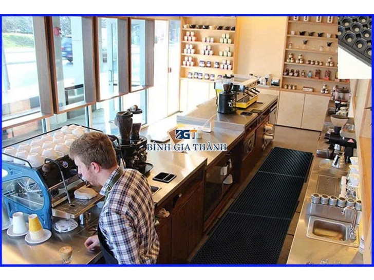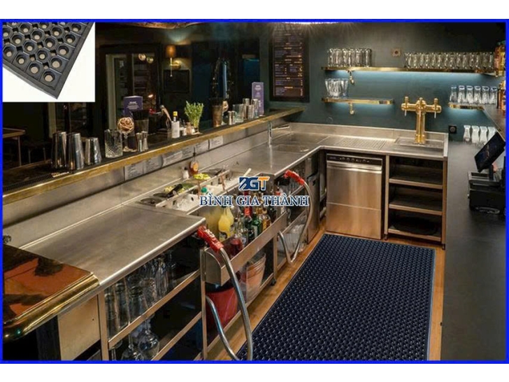 Khu vực quầy Bar và pha chế: Nơi thường xuyên rơi rớt đá viên và đồ uống có đường dễ gây trơn và bết dính. Một tấm cao su mỏng hơn nhưng có độ bám tốt sẽ giúp nhân viên pha chế di chuyển nhanh nhẹn và an toàn.