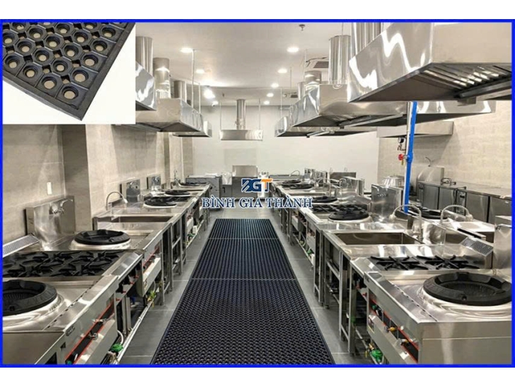 Khu vực sơ chế và chế biến thực phẩm: Nơi đầu bếp đứng cố định trong thời gian dài. Thảm cao su giúp giảm mệt mỏi và giữ chân họ vững chắc khi thao tác dao kéo sắc nhọn.