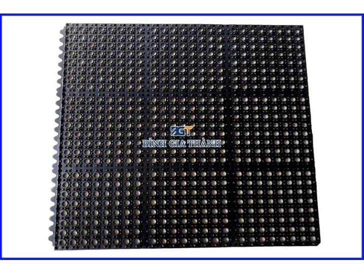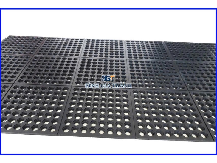 Khả năng chống trượt tuyệt đối trong môi trường ướt: Đây là ưu điểm sống còn. Bề mặt cao su có hệ số ma sát cực cao, ngay cả khi bị phủ một lớp nước hay dầu mỡ mỏng. Thiết kế vân nổi và các lỗ thoát nước giúp triệt tiêu hiện tượng "thủy kích" (lớp nước ngăn cách chân người với mặt sàn), từ đó ngăn chặn tối đa các tai nạn trượt ngã nguy hiểm.